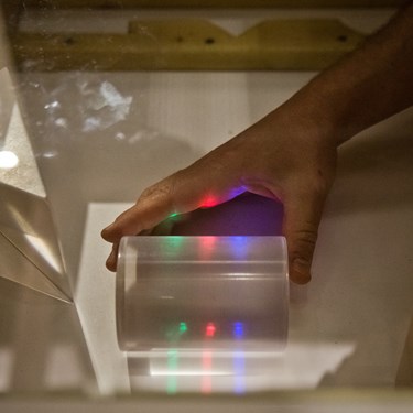 Co trzeba zrobić? Układaj różne bryły na drodze wiązki kolorowych promieni i obserwuj zmiany. Przewróć przeźroczysty walec tak, aby leżał na boku na drodze promieni. Co stanie się z promieniami, gdy walec zacznie się toczyć? Jak to działa? Przeźroczyste bryły zmieniają kierunek przechodzących przez nie promieni dwukrotnie: gdy promień „wchodzi" do bryły i gdy „wychodzi" z niej. W efekcie, prostopadłościan przesuwa promienie równolegle w bok, graniastosłup trójkątny zmienia ich kierunek na ukośny, a walec powoduje, że promienie skupiają się jak w soczewce. Gdy ułożymy walec na bocznej ściance, promienie zagną się w nim do góry i przestaną być widoczne na podłodze.