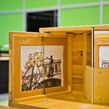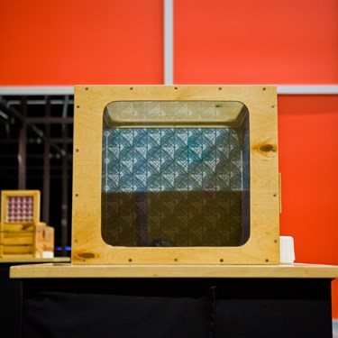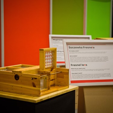 Co trzeba zrobić? Wsuń dłonie do wnęk pod szybkami. Zobacz co dzieje się, gdy powoli unosisz dłonie do góry w kierunku szyb, a co gdy je oddalasz od nich w dół? Spójrz przez szybkę w pionowej ściance na drugą stronę. Ile obrazów widzisz? Jak to działa? Pomiędzy szybami w danej wnęce znajduje się tzw. soczewka Fresnela jedna skupiająca - to ta która powiększa obraz, oraz druga rozpraszająca, która daje obraz zmniejszony. Soczewki Fresnela na tym stanowisku są wytłaczane w przezroczystym tworzywie sztucznym w postaci koncentrycznych rowków o odpowiednim przekroju. Kształt rowków decyduje o tym, czy soczewka jest skupiająca czy rozpraszająca, a nachylenie ich ścianek o powiększeniu, gdy jest ona używana jako lupa. Z drugiej strony znajduje się model soczewki Fresnela oraz tego typu soczewka przecięta na pół. Przez lupę można oglądać w powiększeniu przekrój tej soczewki.