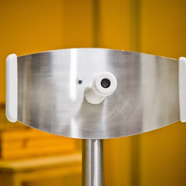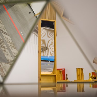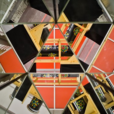 Co trzeba zrobić? Wsuń głowę do wnętrza kalejdoskopu. Spójrz w dół i na boki. Poproś drugą osobę, aby włożyła głowę z drugiej strony. Jak to działa? Trzy lustra ustawione są w kształt trójkąta równobocznego. Lustra są znacznie szersze niż w typowym kalejdoskopie, ale i znacznie krótsze niż w nim. Zwielokrotnione odbicia dają złudzenie ogromnej, ale nieistniejącej przestrzeni wewnątrz takiego kalejdoskopu. Możliwość wsunięcia głowy do środka pozwala na wykonywanie efektownych zdjęć.