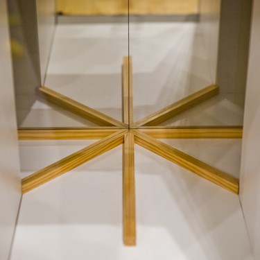 Co trzeba zrobić? Wsuń dłoń w otwór w lewej ściance. Czy widzisz Twoją dłoń w środku sześcianu? Nie wyjmując dłoni włącz i wyłącz lampkę znajdującą się na prawej ściance. Gdzie znika Twoja dłoń gdy lampka gaśnie? Jak to działa? Wewnątrz sześcianu znajduje się ustawione ukośnie półprzepuszczalne lustro. To co wydaje się tylną ścianką jest w istocie odbiciem podłogi w tym właśnie lustrze. Twoja dłoń znajduje się za nim i dopóki za lustrem jest ciemno, jest niewidoczna. Gdy ją oświetlimy, pojawia się. Wewnętrzne ścianki sześcianu są pokryte wzorem maskującym istnienie lustra.
