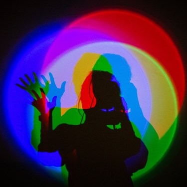 Co trzeba zrobić? Wsuń dłoń w wiązkę światła tak, aby na ekranie powstał cień. Dlaczego cienie są kolorowe i jest ich kilka? Jak kolory cieni i ich liczba zależy od tego, gdzie znajduje się dłoń? Jak to działa? Każdy z trzech kolorowych reflektorów powoduje powstanie innego cienia o ile tylko dłoń przecina wiązkę światła wysyłaną przez dany reflektor. Tam gdzie światło trzech reflektorów nakłada się na siebie, ekran jest biały, podobnie jak biały jest ekran telewizora w tych miejscach, w których świecą się czerwone, zielone i niebieskie piksele. Cień pochodzący od niebieskiego reflektora ma kolor żółty, gdyż ten obszar ekranu jest oświetlony przez dwa pozostałe reflektory: czerwony i zielony. Złożenie tych dwóch barw przez nasz mózg daje efekt żółtego cienia.