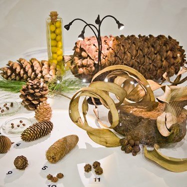 Fragment ścieżki biologicznej „Labirynt ewolucji” prezentujący rośliny nagozalążkowe. Należące do tej grupy roślin drzewa iglaste dominują między innymi w tajdze i w obszarach górskich. Popularna w Polsce sosna zwyczajna to gatunek, który szczególnie często możemy spotkać na suchych i ubogich glebach.